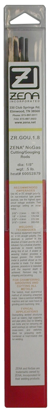 Now you can forget about:the time consuming process of grinding away old welds and/or grinding a bevel for re-welding,needing (and having to cart around) an oxyacetylene rig to cut metal in the field, orhaving to invest big bucks in an air-arc cutting equipment (or worrying about starting fires when using it out doors).ZENA NO-Gas arc cutting/gouging rods let you gouge, bevel, and cut metal without needing a 300+ Amp air-arc gouging/cutting rig or an acetylene cutting torch and bulky gas bottles. We can't convert your electrode holder to a plasma torch/plasma cutter but, for field maintenance work, these rods are the next best thing to having an oxyacetylene rig, air arc system, or a powerful plasma cutter with you in the field! Description:Air or gas free metal working electrode -- for expedient and economical grooving, beveling, chamfering, and gouging without any special equipment.Replaces a cutting torch.Reactionary flux coating creates high level arc blast and forms an electrically conductive "cup" for ease of arc re-strike.Multiple rod diameters available to allow you a high degree of control over the cutting process -- and to allow use of our cutting rods with small or large arc welders.Current Type/Polarity: