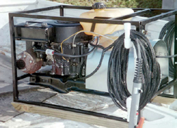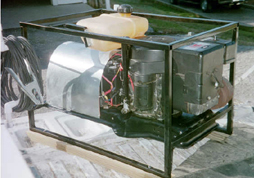 To make the installation simple, the owner used the mower's existing steel floor/frame plate, to which the mower engine was already attached, as the mounting mechanism for the welding power generator as well (see side views). All that had to be done was to cut a hole to accommodate the power generator's pulley and fan and drill a couple of holes to rigidly mount the power generator to the floor plate. V-belt tension is adjusted by means of an idler pulley which was used in the mower. A metal frame was made from 3/4" square (1/8" wall) steel tubing to enclose the welder and to provide a mechanism for mounting the engine/power generator, the mower's old gas tank, the mower's battery, starter solenoid, and starter switch. The frame also serves as a mechanism for keeping welding cables organized A piece of sheet metal was used to provide a bit of protection from the elements to the welding power generator and battery -- and to dress up the completed unit. The well satisfied owner reports that this weekend project was completed on schedule -- and that the total cost of his finished welder was less than $700. He also plans to add an external voltage regulator and use the unit for quick charging batteries.